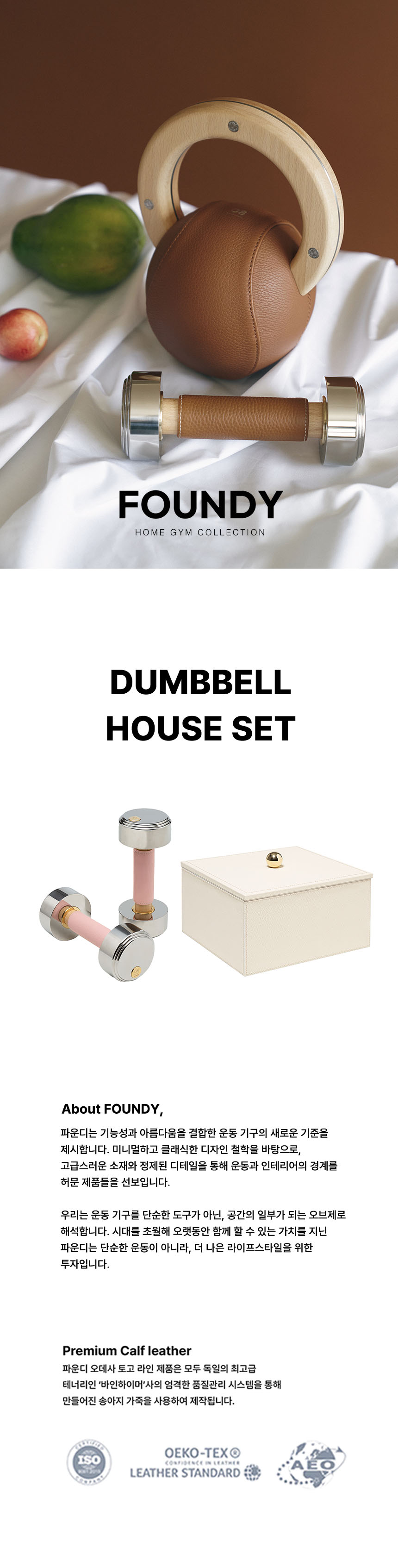 파운디의 시그니쳐 '에센셜 덤벨'과 최고급 앱송 가죽으로 만들어진 덤벨 보관 케이스가 함께 제공되는 세트입니다. 덤벨 2pc로 구성된 세트제품 입니다. 덤벨과 케이스의 컬러는 개별 선택 가능합니다.